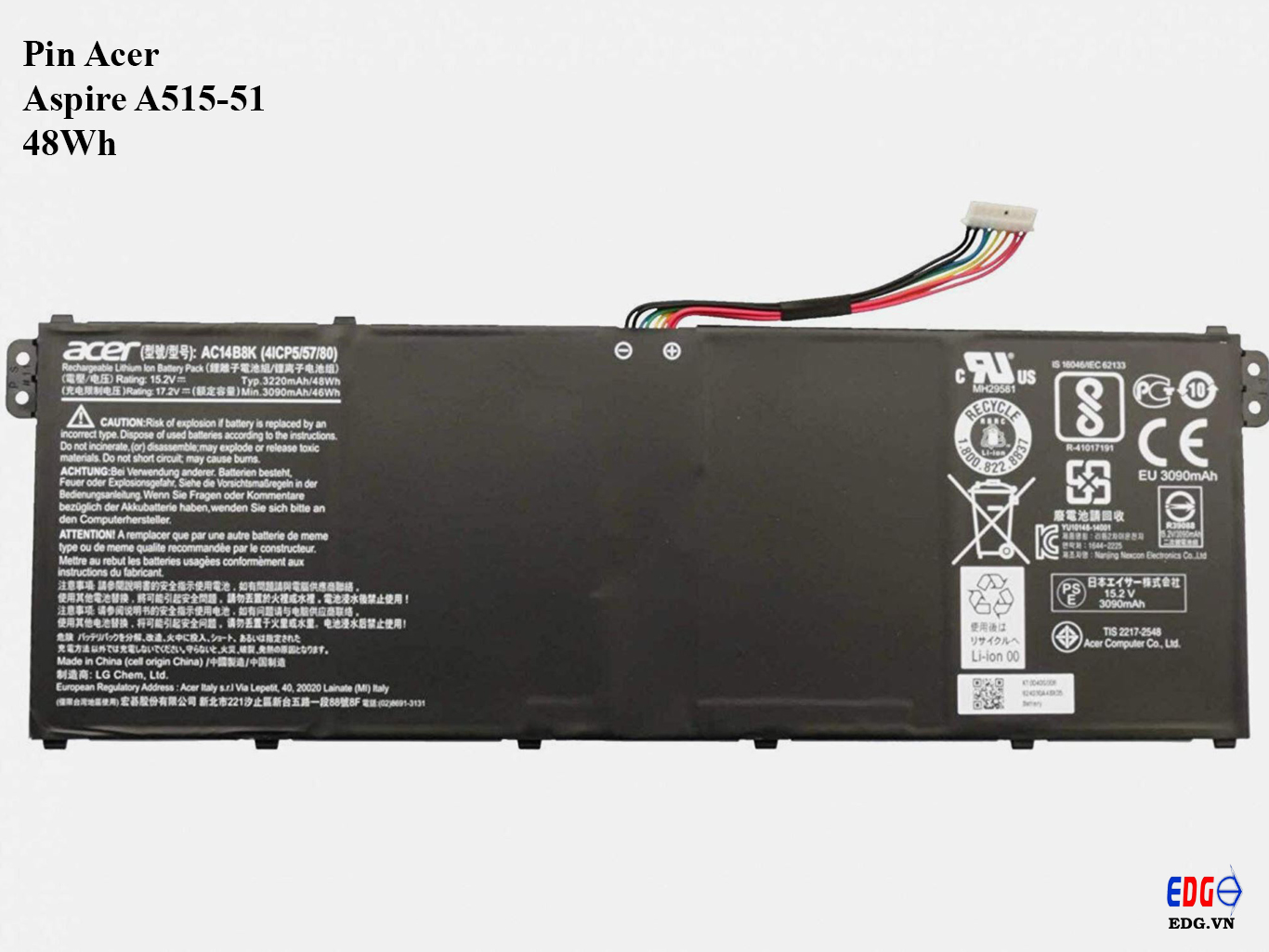 Pin Laptop Acer Aspire A515-51 Thay thế cho Pin Laptop Acer Aspire A515-51 Mã của pin : 4ICP5/57/80, AC14B8K, KT0030G.004, KT.0040G.004Thống số : Dung lượng : 3220mAh 48Whđiện áp : 15.2v Số cell : 3 cell Đt : 0968365566