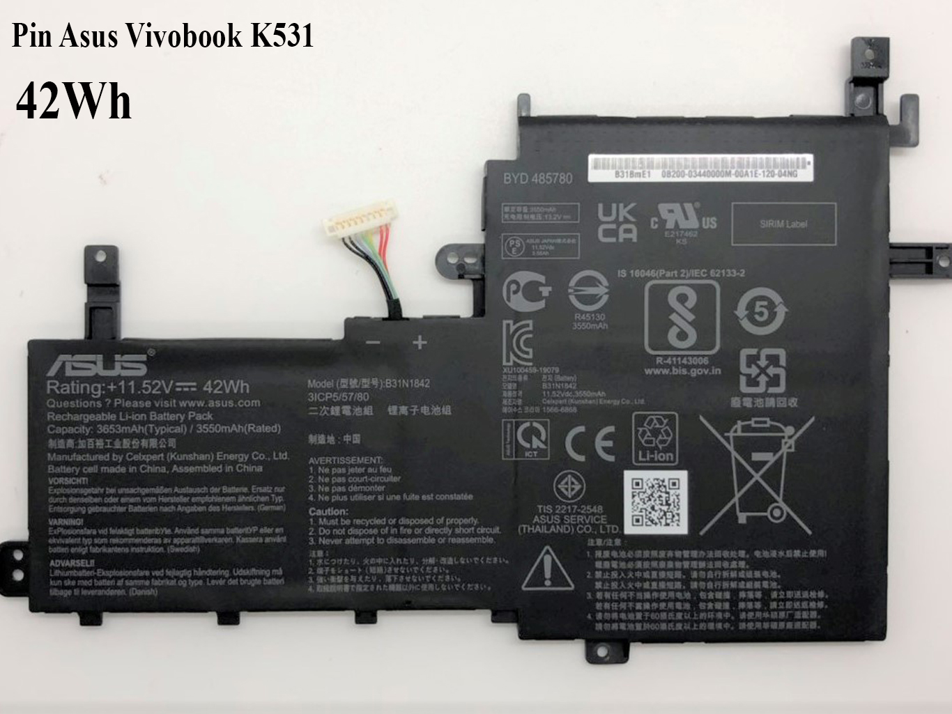 Pin Laptop Asus Vivobook K531Lắp ráp thay thế trực tiếp Thông số : Pin Laptop Asus Vivobook K531Type : B31N1842Dung lượng : 42Wh 3550mAhĐiện áp : 11.52VSố lượng Cell : 3 cell Bảo hành 06 thánghình ảnh : Pin Laptop Asus Vivobook K531ĐT : 0968365566